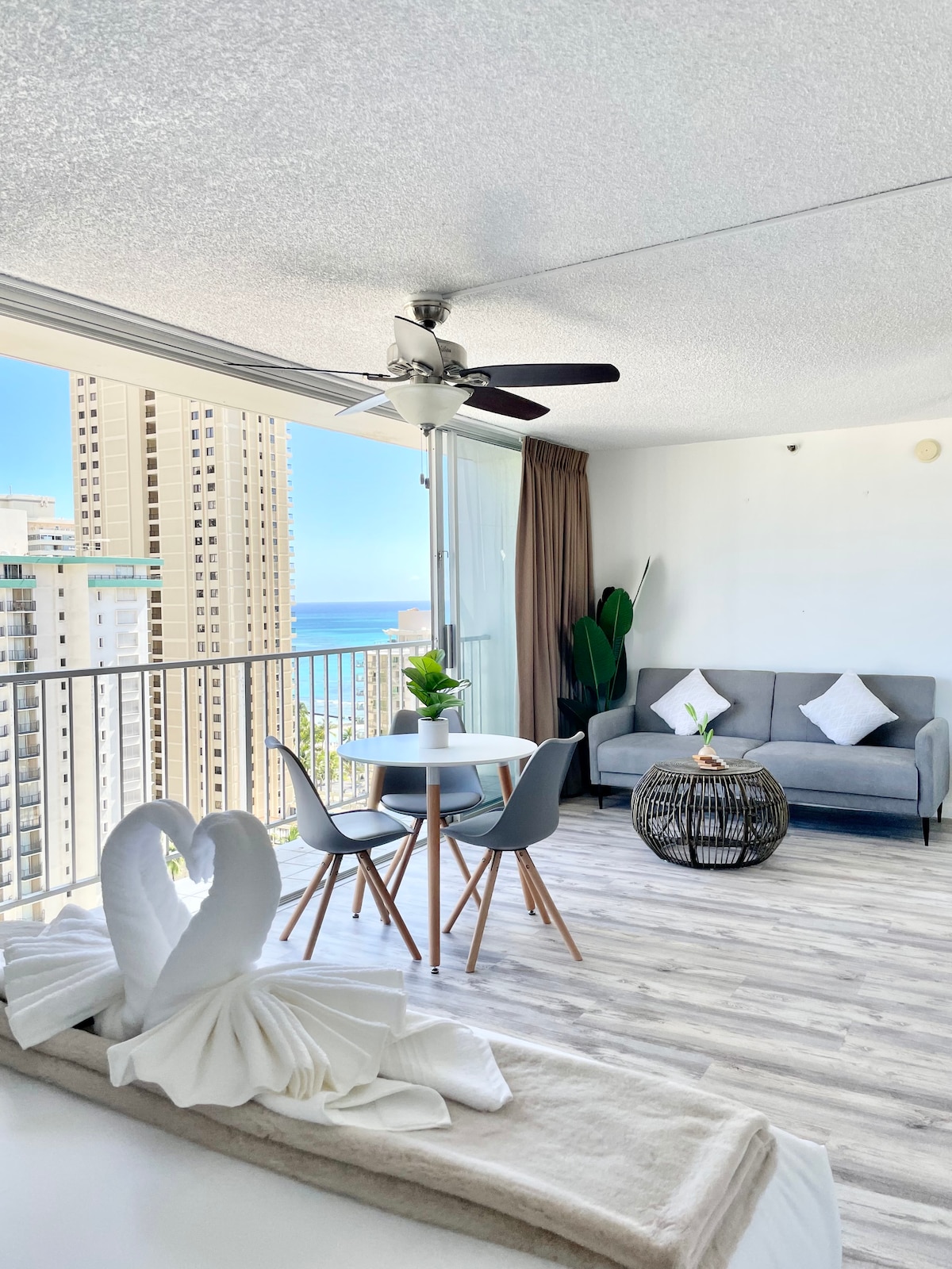 Your dream Vacation to Waikiki, Hawaii is about to begin! Wake up to amazing ocean view from our 26th floor, completely remodeled beautiful studio. Everything is brand new in this cozy comfortable sweet home. Then, after a day of adventuring in the world-famous island O'ahu, come back to a comfortable brand new queen bed, modern kitchen with a big refrigerator and induction cook top, a coffee & tea station to relax and unwind. This is your vacation to enjoy, and we can't wait to host you.
