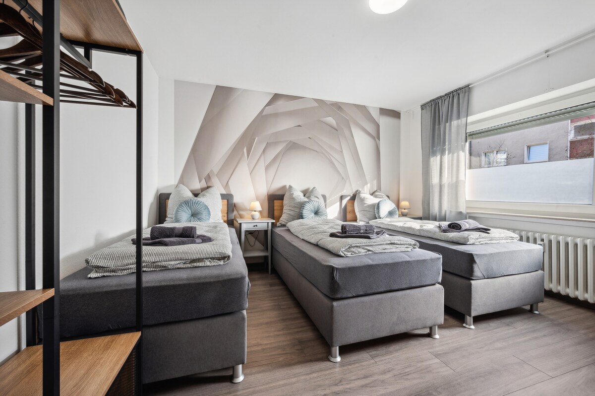 Beautiful 65 m² apartment in the heart of Duisburg with a large balcony 🏖️ (incl. seating area & Strandkorb) and perfect connections to Duisburg Central, Düsseldorf & Messe Düsseldorf 🚆 Highlights: U-/tram stop (Platanenhof) 200 m (U79/903) 🚋 Central yet quiet 🌳 Underfloor heating 🔥 Fully equipped kitchen 🍽️ Home office space 💻 Rain shower 🚿 In-room bar 🍷 Smart TV with Netflix 📺 Ideal for city trips or business stays ✨ Fast charging station for electric cars right on the street ⚡🚗