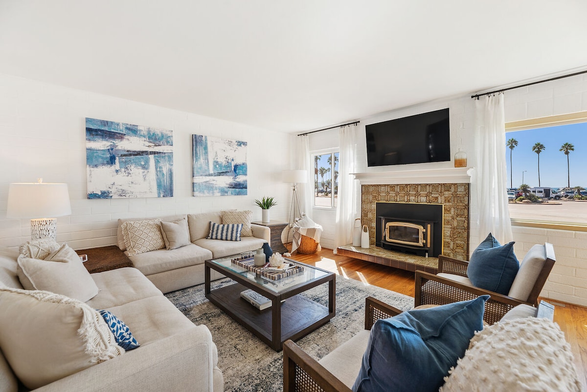 Escape to this stunning 2-story beach house with ocean views from nearly every room. Soak up the sun on the rooftop deck, unwind by the fire pit, play in the game room, or enjoy the open-concept living area with a fully equipped kitchen and central AC. Just steps from the beach and 2.2 miles from Legoland, this 3BR/2BA retreat offers a washer/dryer, ample parking, and easy self check-in—everything you need for the ultimate coastal getaway.