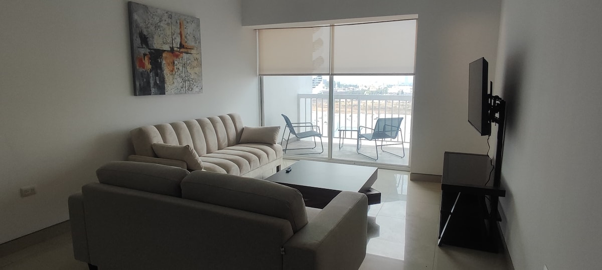 Enjoy a quiet stay in the comfort of a fully-equipped luxury apartment next to the Sonata District at High Tower Elite. We know that the most important thing is your well-being and that of your loved ones. Enjoy all our amenities, from a semi-Olympic pool, playroom, gym, cinema, sky view games room, and much more. In the apartment you have 1 bedroom, a full bathroom, kitchen, dining room, living room and 1 parking space for 1 car. 24-hour security service.