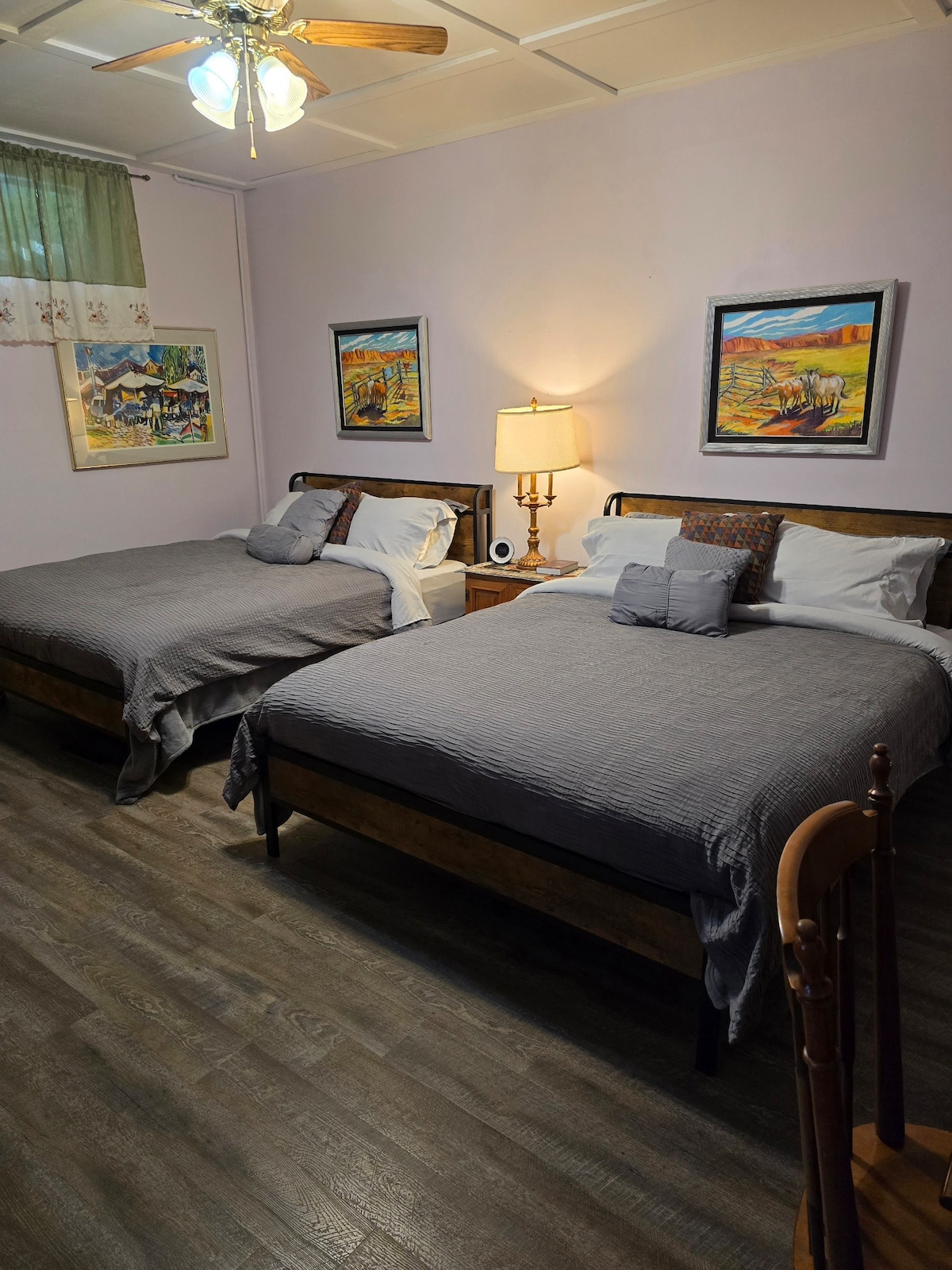 Equestrian Room has two (2) Queen bed with private full bathroom. Rate $120.00 is based on single/ double occupancy. Over 2 guests are added fee of $20.00 per night per guest. Room has 50" flat screen TV, WIFI, mini fridge. Continental breakfast and sales tax included in rate. Breakfast is coffee, tea, juice, creamer and fruit. WE DO NOT ACCEPT GUESTS RESERVATIONS OR CHECK INS AFTER 1000PM UNLESS SELF CHECKIN HAS BEEN ARRANGED/ BOOKED BEFORE 1000 PM THE DAY OF RESERVATION ●NO PETS ALLOWED