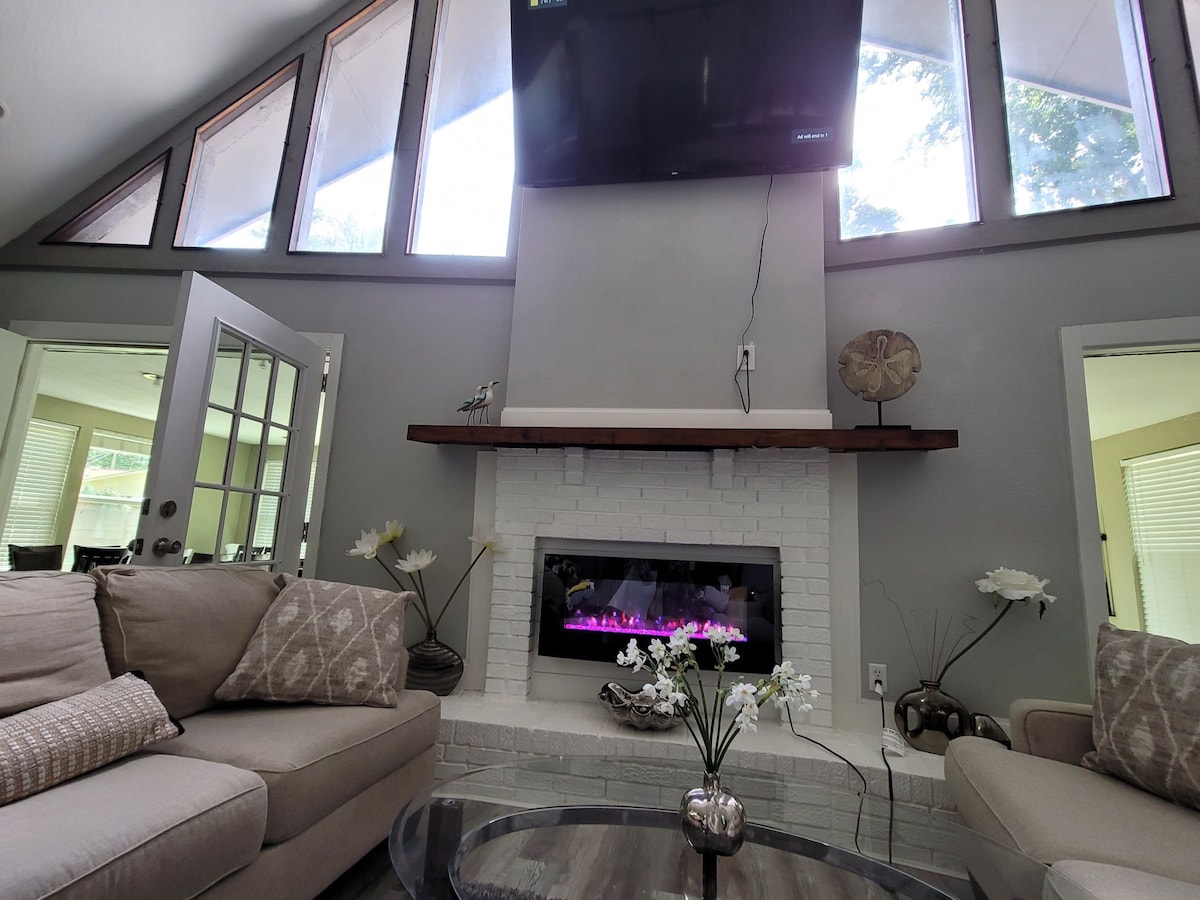 Completely remodeled house 5 bed/4,5 bath easy able to accommodate 24 people for comfortable vacation. You'll see unic construction with high ceiling , spiral stairs,beautiful lights and fireplace in the living room, very large yard , plenty of parking spots. 12 min away from the public beach with truly clear azure water and sugar white sand , close to Destin on one side ,Navarre beach on the other side, Crab Island, shopping and restaurants .located in the heart of Fort Walton Beach .