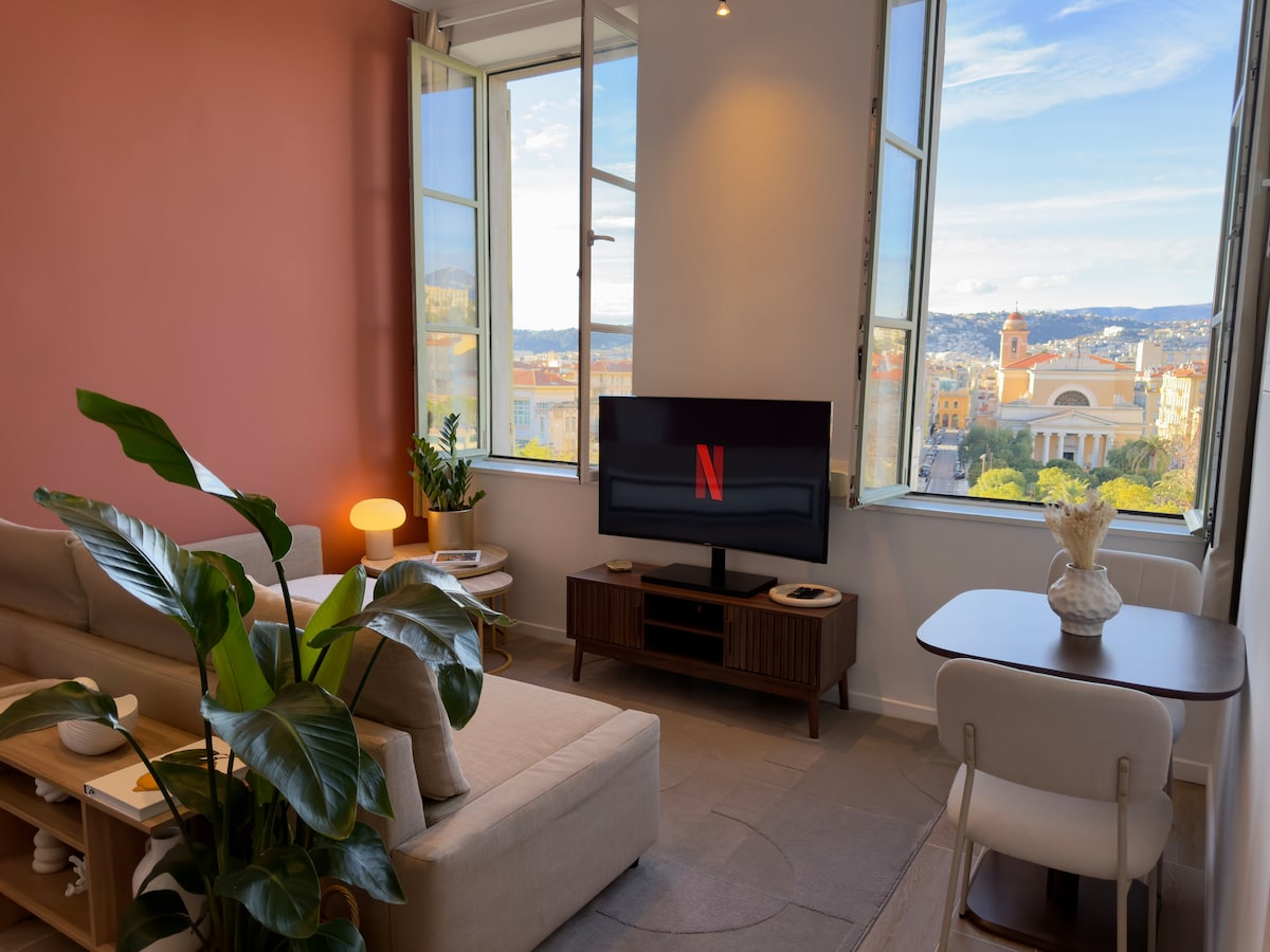 Perched on the top floor without elevator, the apartment boasts breathtaking views of the magnificent church towers of the Old Town and the azure waters of the sea at the back, allowing guests to immerse in the beauty of Nice. Here, you are just a 5-minute walk away from the beaches, allowing you to enjoy the sun-soaked shores of Nice and the Promenade des Anglais. Explore the enchanting streets of Old Nice, discover its rich culinary scene, and fall in love with its quaint and romantic charm.