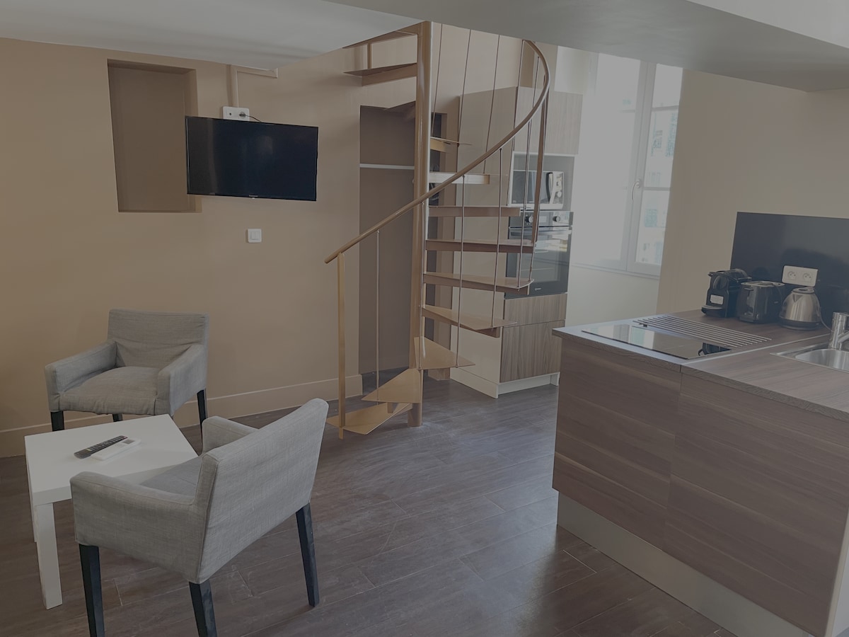 Refurbished 49 m2 loft in the heart of Nice opposite the SNCF train station – ideal for discovering the French Riviera! This accommodation has a beautiful fully equipped open-plan kitchen, a bathroom with walk-in shower + island bathtub and double sink, a living room with 2-seater sofa bed, mobile air conditioning, electric fireplace, a large dressing room and a 90 cm high mezzanine with double bed. This accommodation has all the comforts for a stay with friends and family.