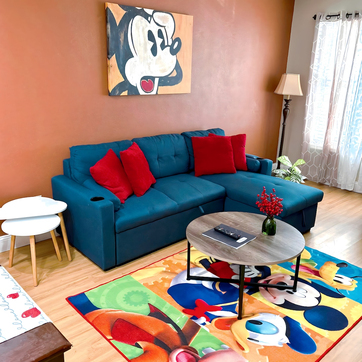Bring the aloha spirit to your Disney trip in this Lilo & Stitch–themed studio at Legacy Grand in Kissimmee! Just 4 miles from Walt Disney World, this tropical escape features two queen beds with glowing LED “floating” frames, vibrant murals, and character details everywhere. Guests enjoy hotel-style amenities like a pool, shuttle to the parks, and on-site laundry, making this playful retreat the perfect mix of convenience and fun.