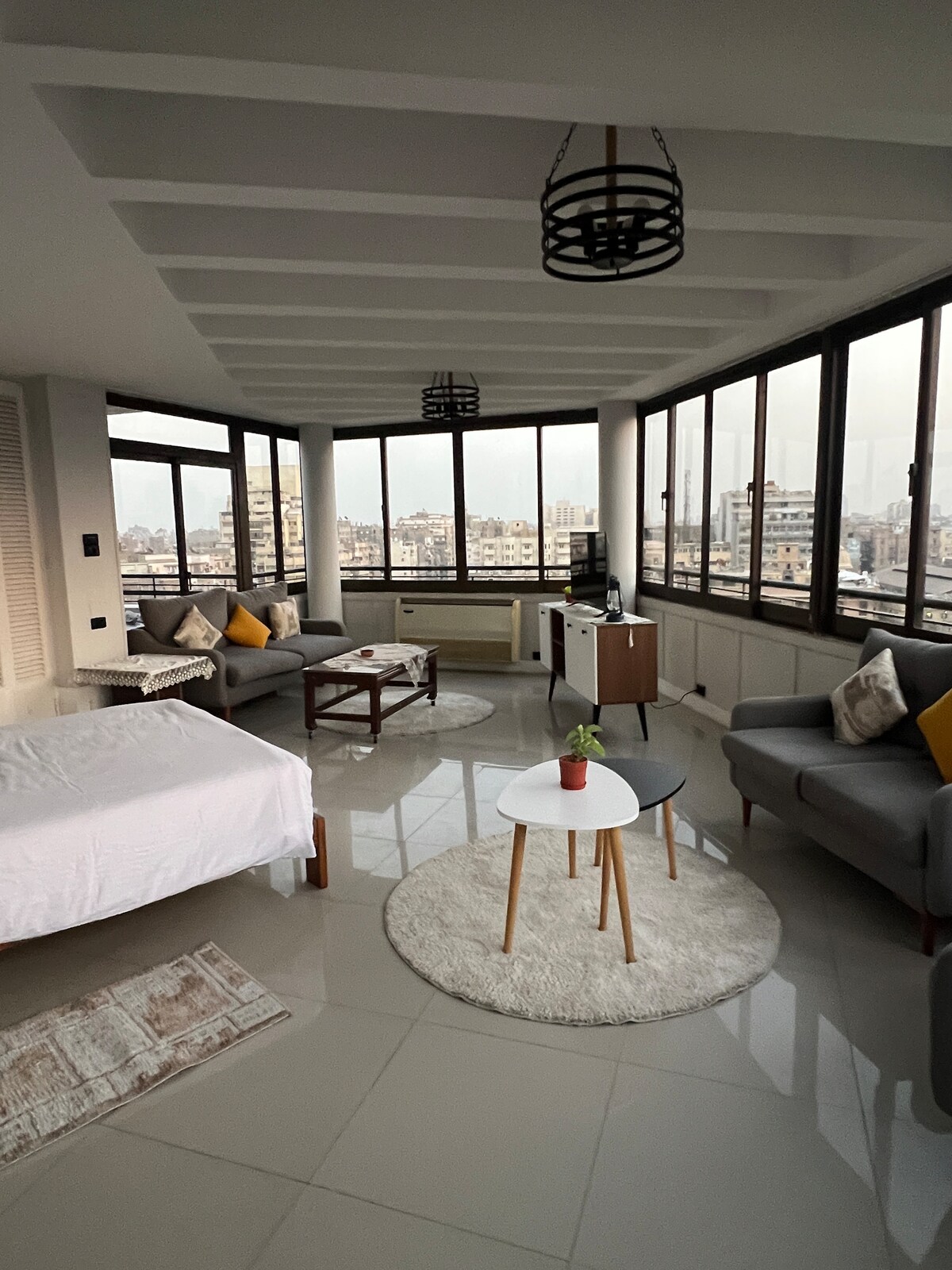 City Skyline Views: Charming, Cozy 1 bedroom 1 bathroom apartment in Agouza. Close to Tahrir Square, Egyptian Museum, Zamalek neighborhood and walking distance to British Council. 64m2 Terrace with beautiful view over the Nile and Cairo Tower. It is fully equipped with all you might need, freshly renovated.