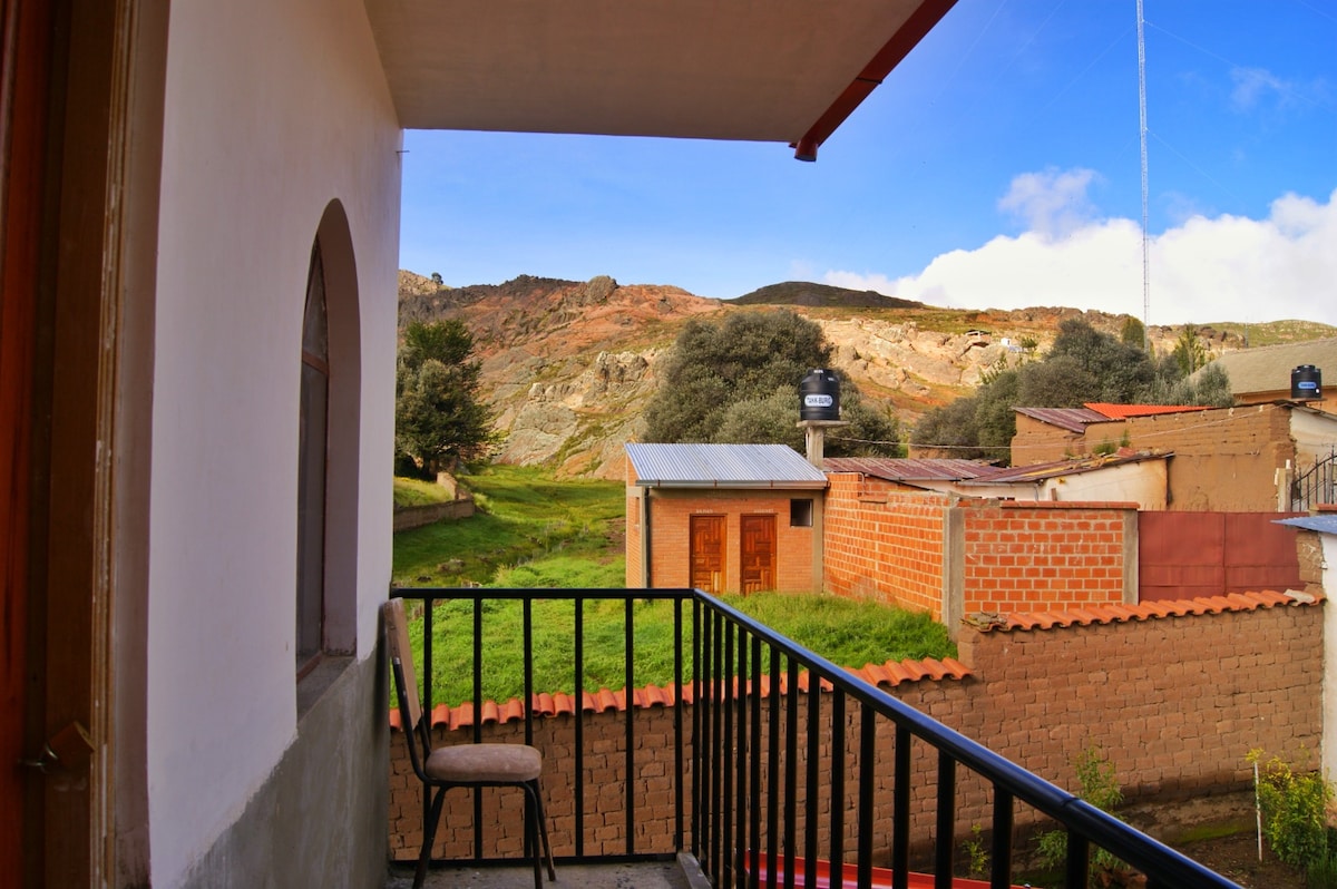 Nice rustic rooms with view of the glacier Ilmampu. Located at 2700 masl in Tutuacaja indigenous community, 5 km from the old colonial town Sorata, between the wild river and a highest viewpoint of the district. You stay with a family, breakfast is included in the price. You stay in the rustic part of the house, three nice warm rooms with thick clay walls. See even panoramic view - panoramic house.