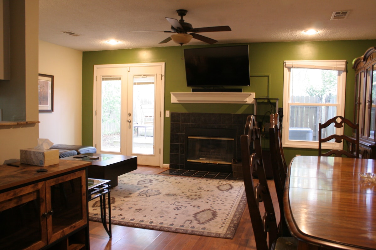 We hope you enjoy our Auburn townhome! This two-story home sleeps 6. It has 2 master bedrooms - upstairs and downstairs. Plus there’s a large loft with a trundle bed (sleeps 2). You’ll love relaxing in the den with its tall two-story ceiling. This area has a flat-screen tv and fireplace. The kitchen is eat-in, and outside is a private, covered patio with a fire pit. It's in a great location only 4 miles (approx 10 min. drive) to AU. Hope you can visit our “home away from home”!