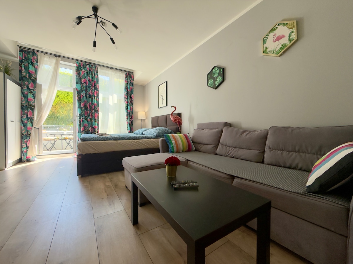 A cozy studio with a balcony on the ground floor, in a free parking zone. Ground floor apartment. Pets are allowed. You can smoke🚬 on the balcony. Extended check-out time until 12:00. For an additional fee of 40 PLN - until 2:00 p.m.👌