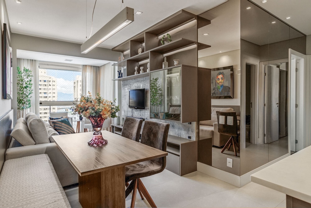 Apartamento de alto padrão no Bairro Estreito em Florianópolis, poucos minutos do centro e próximo de tudo. Condomínio completo com 1 vaga privativa, piscina, academia, coworking, mercado , sala de reuniões, lavanderia paga. Apto com estilo, conheça Florianópolis e fique em um apto bem decorado e com tudo para passar ótimos dias. Cozinha de chef, Box com 2 chuveiros e cama Queen, entre outras coisas.