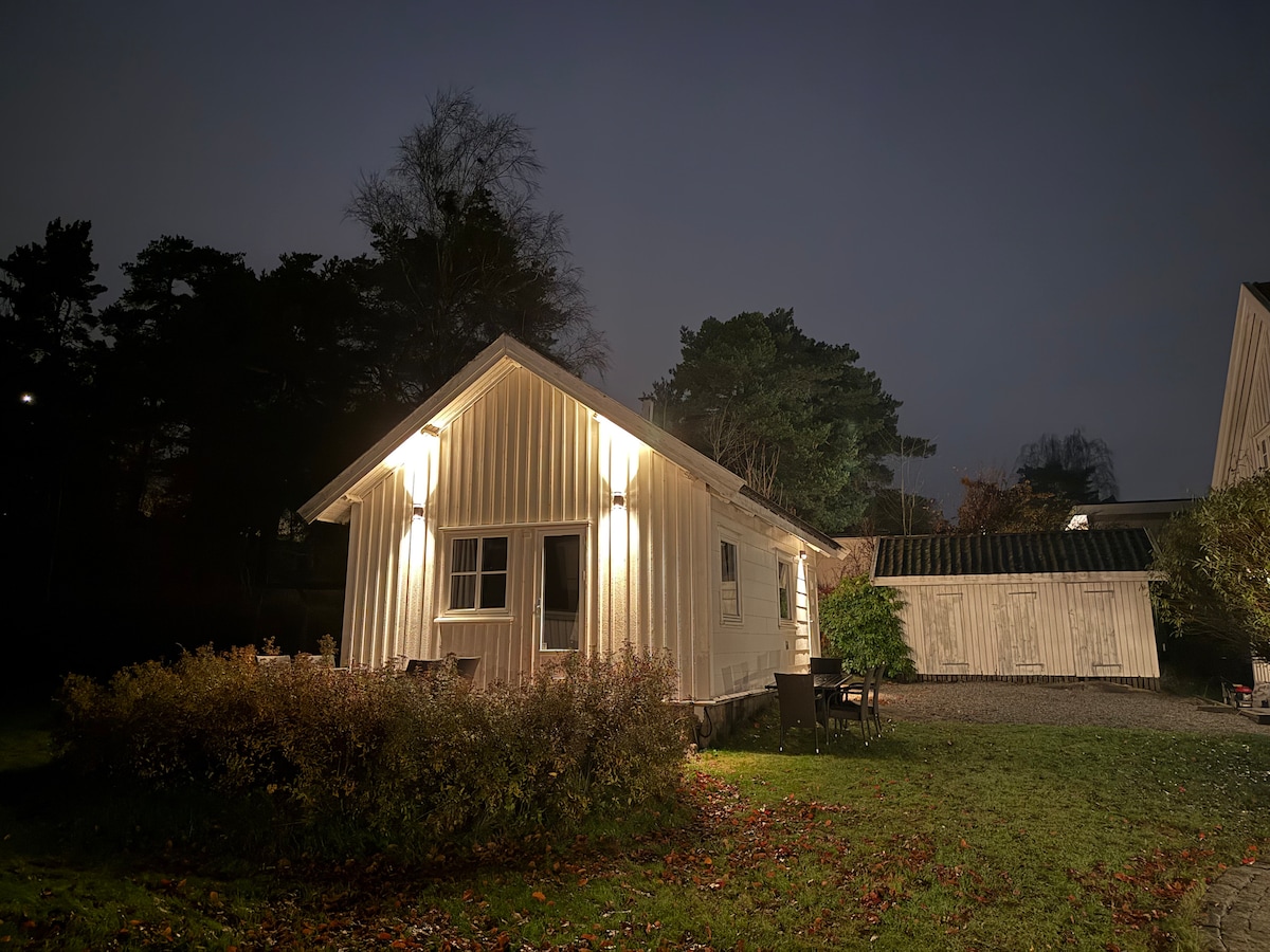 Koselig liten hytte i hage ved siden av utleiers bolig. Inneholder et lite soverom med en ganske høy dobbeltseng på 150cm adskilt fra oppholdsrommet med forheng. Hytta egner seg for 2 personer. Det er en 2seter sofa i oppholdsrommet, liten sittebenk ved spisebordet og bad. Hytta inneholder et minikjøkken med utstyr for matlaging. Veranda utenfor som hører til, med bord og to stoler. Det er ikke kjørevei fram til hytta, så bagasje må bæres fra p-plassen og opp, ca 50-60m.