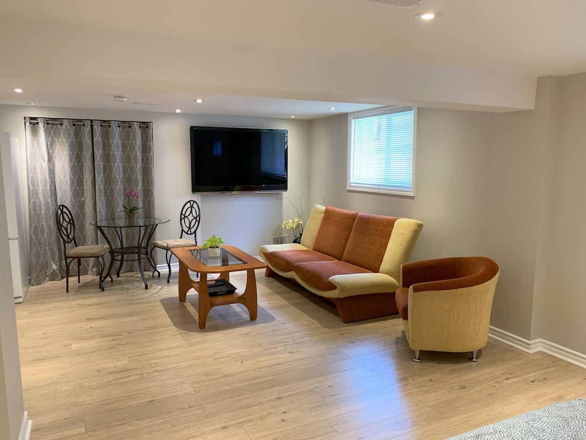 This modern basement apartment enjoys an extremely prestigious and convenient location situated on one of the city’s beautiful street, with a wonderful variety of restaurants, cafes, shops and sights within walking distance. Equipped with a king bed, Keurig with complimentary coffee and tea, 2 flat screen tv's with Netflix and Roku tv. Free parking in the driveway(one car) Good for small families, couples, solo adventurers and business travelers.