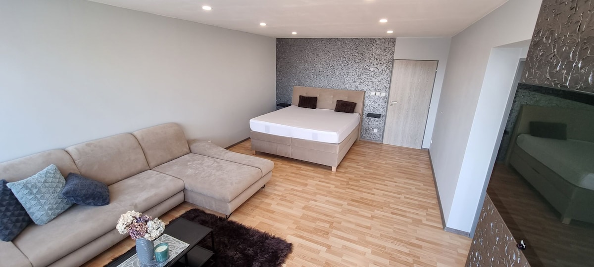 Beautiful apartment 110 m2 in a quiet courtyard and close to the center. One parking space in front of the house. Two bedrooms with luxurious Boxspring beds, TV and sofas for full sleep. Fully equipped kitchen with access to a covered terrace with outdoor seating for 6 people, barbecue and views of Svatý Kopeček. Balcony with seating for 2 people. Dressing room, toilet, bathroom with walk-in shower. Lockable bicycle room on the ground floor. Shops, restaurants, bakery, swimming pool, etc. directly on the street of the accommodation.