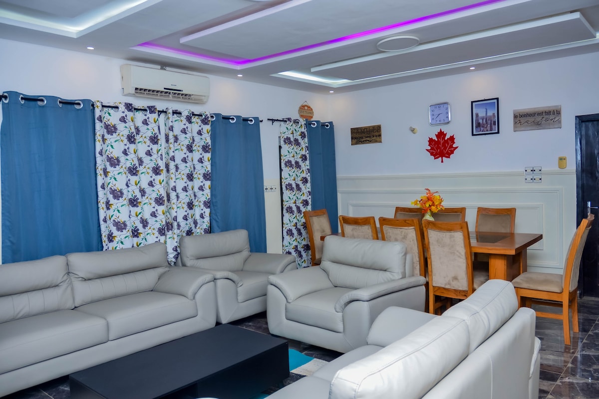 Entire and independent accommodation with three furnished, air-conditioned bedrooms... modern on the second floor, 5 minutes from the Tankpè crossroads, quiet and accessible. For couples and whole families. this great place offers you plenty of space and amenities for an optimal stay. Smart TV in 2 bedrooms Unlimited internet. DTT TV Fridge and freezer available Maintenance services barbecue NB Inflatable hot tub for 6 people negotiable not included in the price