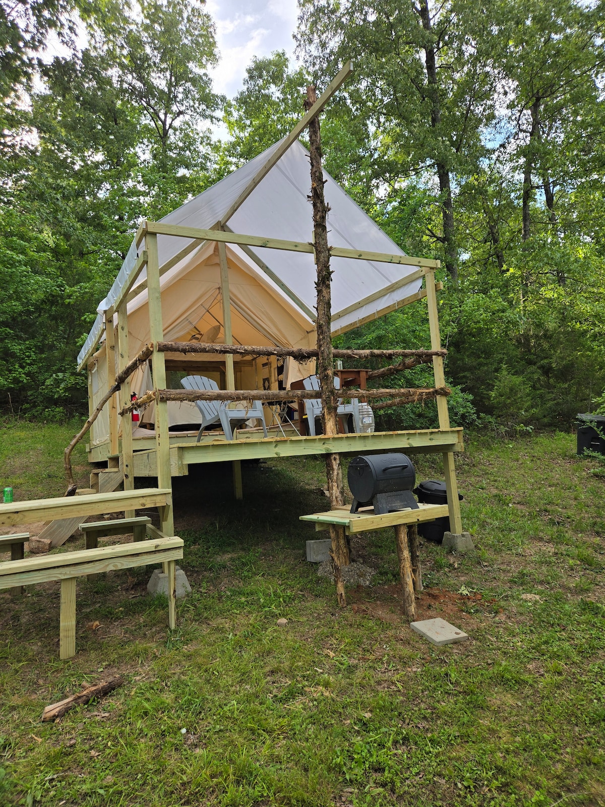 Nestled in the serene beauty of the Ozark Mountains near the Buffalo National River, this luxurious glamping tent offers the perfect blend of rustic charm and modern comfort. Inside, you'll find a plush queen-sized bed with soft linens, ambient lighting, and charming décor that brings the outdoors in. With easy access to hiking trails, kayaking, and wildlife viewing, this glamping retreat offers a peaceful escape into nature—without sacrificing comfort.