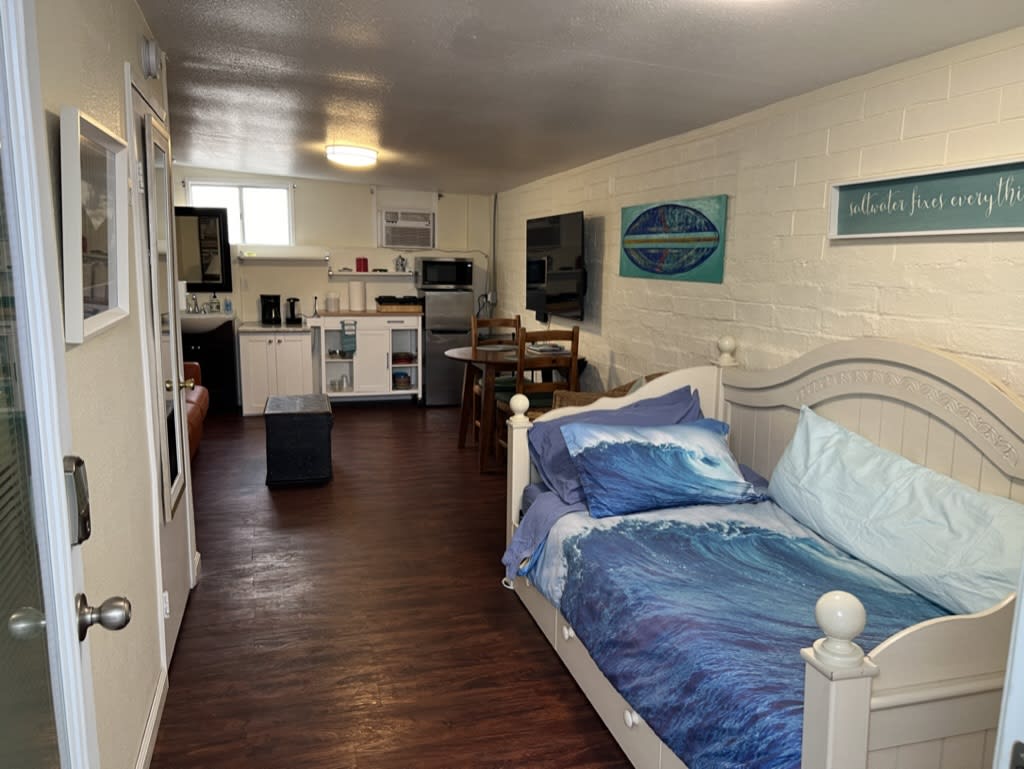 Perfect for staycations, remote work, romantic getaways, or extended stays (weekly & monthly). No parties, please. Charming 1 bed, 1 bath cottage offers resort-style comfort for two guests. Plush queen-sized bed, a luxurious bathroom and fully equipped kitchen. Step outside to your private courtyard and backyard—complete with a firepit, BBQ and outdoor shower. Includes free street parking, bikes, a Pack ’n Play, boogie boards, beach toys, cooler, and more!