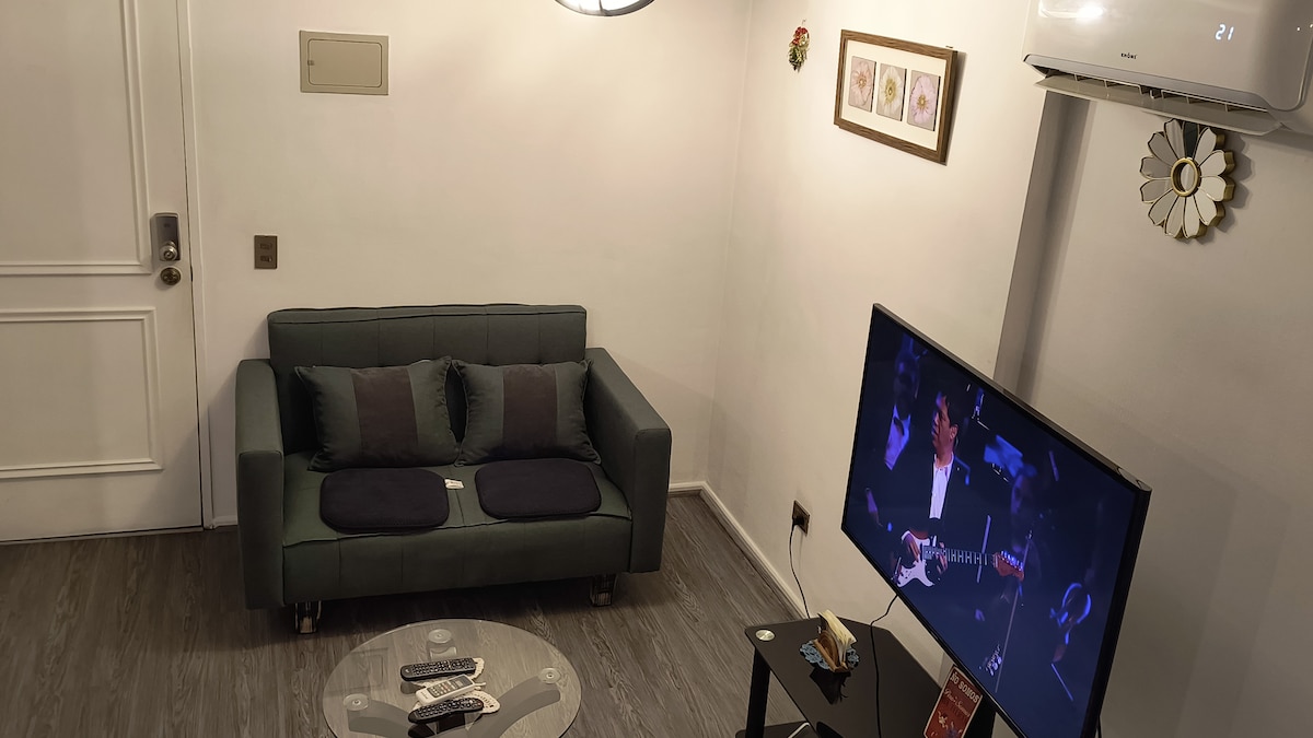 An apartment equipped to make you feel comfortable and able to rest, work or explore the capital of Chile, fully equipped: The apartment has a washer/dryer, Wi-Fi Internet, air conditioning, Smart TV, 2-seater bed (with sheets and blanket), hair dryer (fully equipped bathroom with towels, shampoo and conditioner), among other amenities. Steps from the Palacio de La Moneda (Presidential Palace), green areas, playgrounds, Caupolicán theater.