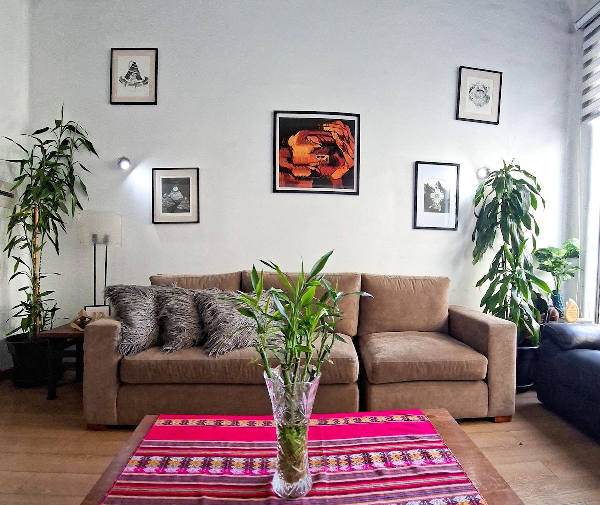 Esta joya está escondida en la mejor zona residencial. Departamento dúplex ubicado en el 2do piso, recientemente remodelado con fácil acceso a comercio, cafés, bancos, farmacias, tiendas de comestibles y boutiques, museos, parques, gimnasios y restaurantes. WalkScore nos dio un 89- muy caminable. 2 áreas de escritorio separadas por piso para trabajar cómodamente e Internet de alta velocidad 100. Contamos con una zona de lavado en área común.