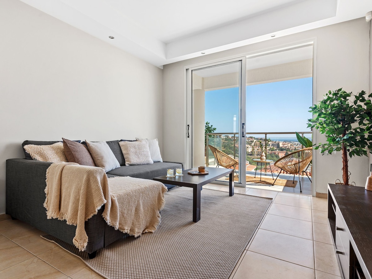 A beautiful, bright apartment with gorgeous decor, and gorgeous sea and sunset views. Spacious living/dining area with large screen TV, well-equipped kitchen (with dishwasher and coffee machine). The bedroom has an adjacent bathroom (with large walk-in shower) Two balconies – with dining table and chairs, sunbeds, comfortable seating and gas BBQ. Free wifi is included, heaters for winter comfort, air-conditioned throughout and comprehensive TV system with International sports and movie channels.