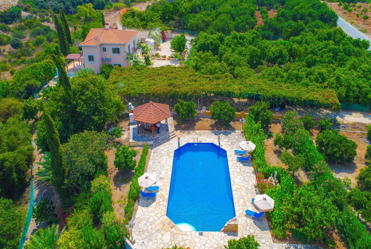 FULLY AIR CONDITIONED designer villa (180m2) standing on its own fenced grounds (2700m2 plot). Ideal for couples and families! Beautiful serene environment! Outstanding views of the Mediterranean sea, the Troodos mountain and the Akamas National Park! Prices include the use of air conditioning and all local taxes! No extra charges whatsoever!