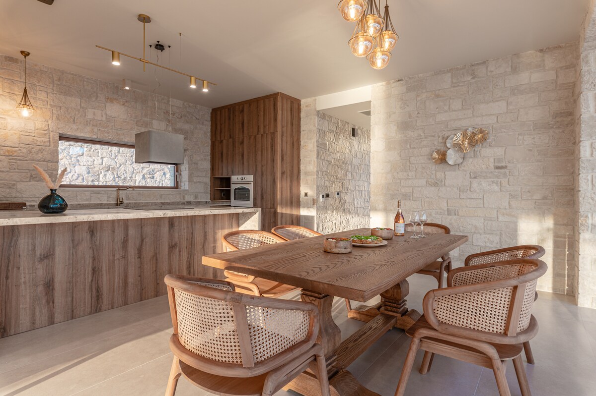 Welcome to your dream villa, built in contact with a rock formation! This residence offers two bedrooms with private en-suite bathrooms. (1 with extra sofa bed) The villa is situated on an 6000m2 plot filled with pine trees and olive groves. Several steps lead down to your secluded beach.The kitchen and the dining room in the aithrio feature panoramic sea views.The outdoor spaces of 120 m2 include a sitting area protected by a shading pergola,sun loungers an outdoor dining place,barbeque, shower