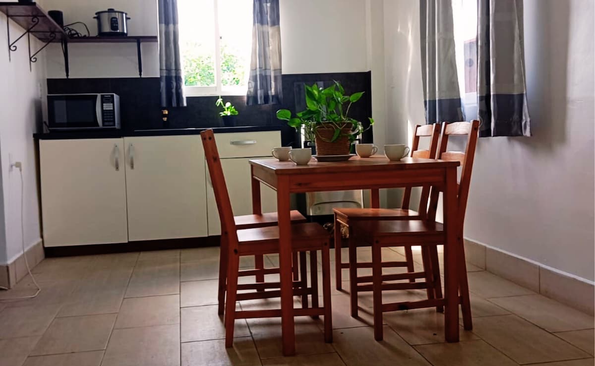 Centrally located luxurious studio, saltwater pool with sundeck, private bathroom/toilet, fully equipped kitchenette, 1 double bed and sofa bed sleeps max. 2/ bed. Breakfast at Elementz Beans & Bites upfront, supermarket nextdoor. Nighttime security, safe neighbourhood, 10 -15 min drive from citycenter and shoppingmall. Kids under 5yrs stay for free. No pets. Airport shuttle possible(contact the frontdesk)