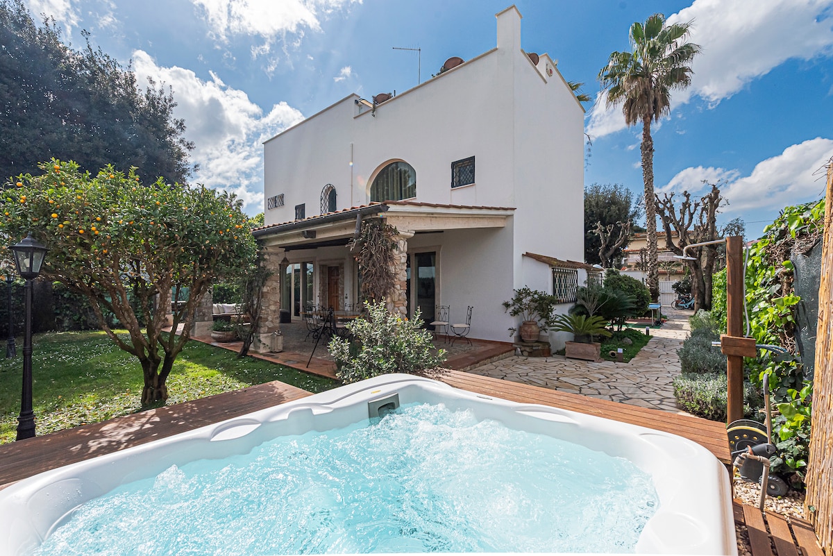 Wellness Beach Villa, direct bus to Rome at walking distance. Relax in the heated outdoor Jacuzzi pool (not suitable for swimming) or unwind in the Finnish sauna. Cozy up by the fireplace, enjoy spacious living areas, a fully equipped kitchen, and a patio with BBQ and garden dining. 5 bedrooms, 4 bathrooms, gym, table tennis, Wi-Fi&SMART TV, AC, private parking. Optional services: Transfer, bikes, wine tours, private chef. Cleaning €180, payable on site. Enjoy your private seaside paradise