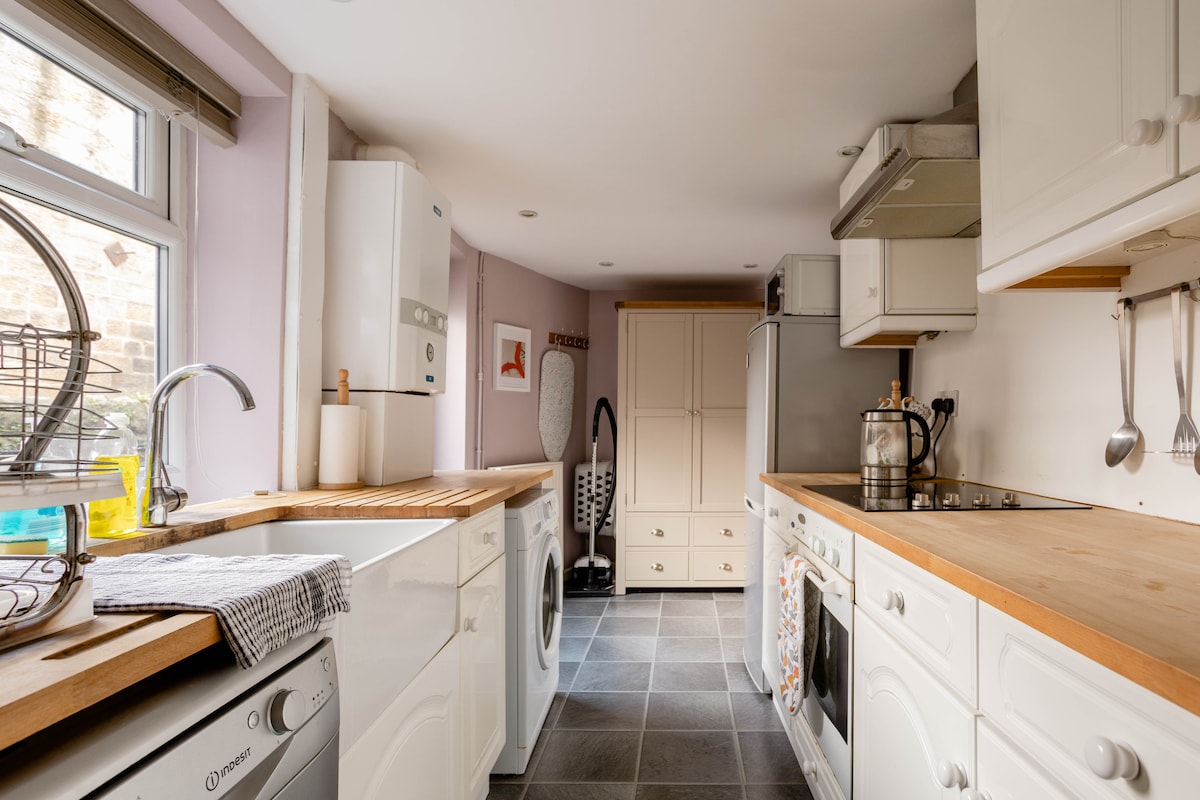 Relax in style at this beautiful cottage in Haworth. A 2 min stroll leads to the home of the Bronte’s & the famous cobbled Main Street. Full of charm & character with original features such as beams; fireplaces; window seats & exposed Yorkshire stonework. Balances modern convenience with the uniqueness of a cosy cottage. An indulgent get away; statement bathroom; king bed; 1000 TC bedding; leather settees; bar stools & table; log burner; quality kitchen; Belfast sink. Renovated with love & care