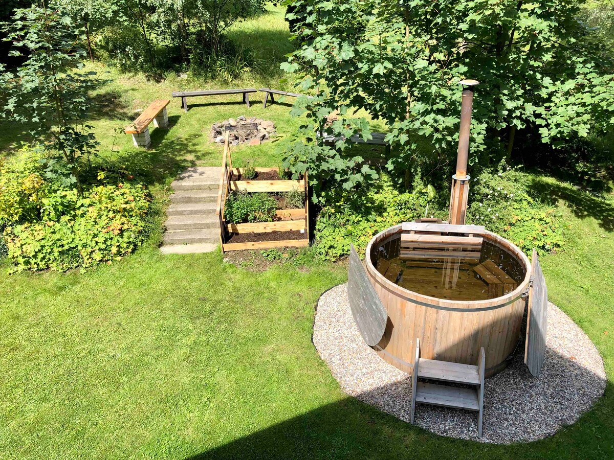 Come and relax from the hectic life in our cottage in the heart of Podkrkonoší. All comforts from hot water to air conditioning are a matter of course. The glass terrace allows you to enjoy the surrounding beauty of nature from the comfort of the interior. Here you can enjoy a morning coffee or a romantic dinner. There is a fully equipped kitchen and an outdoor grill. And wellness? Forget all your worries in our outdoor year-round hot tub under the open sky!