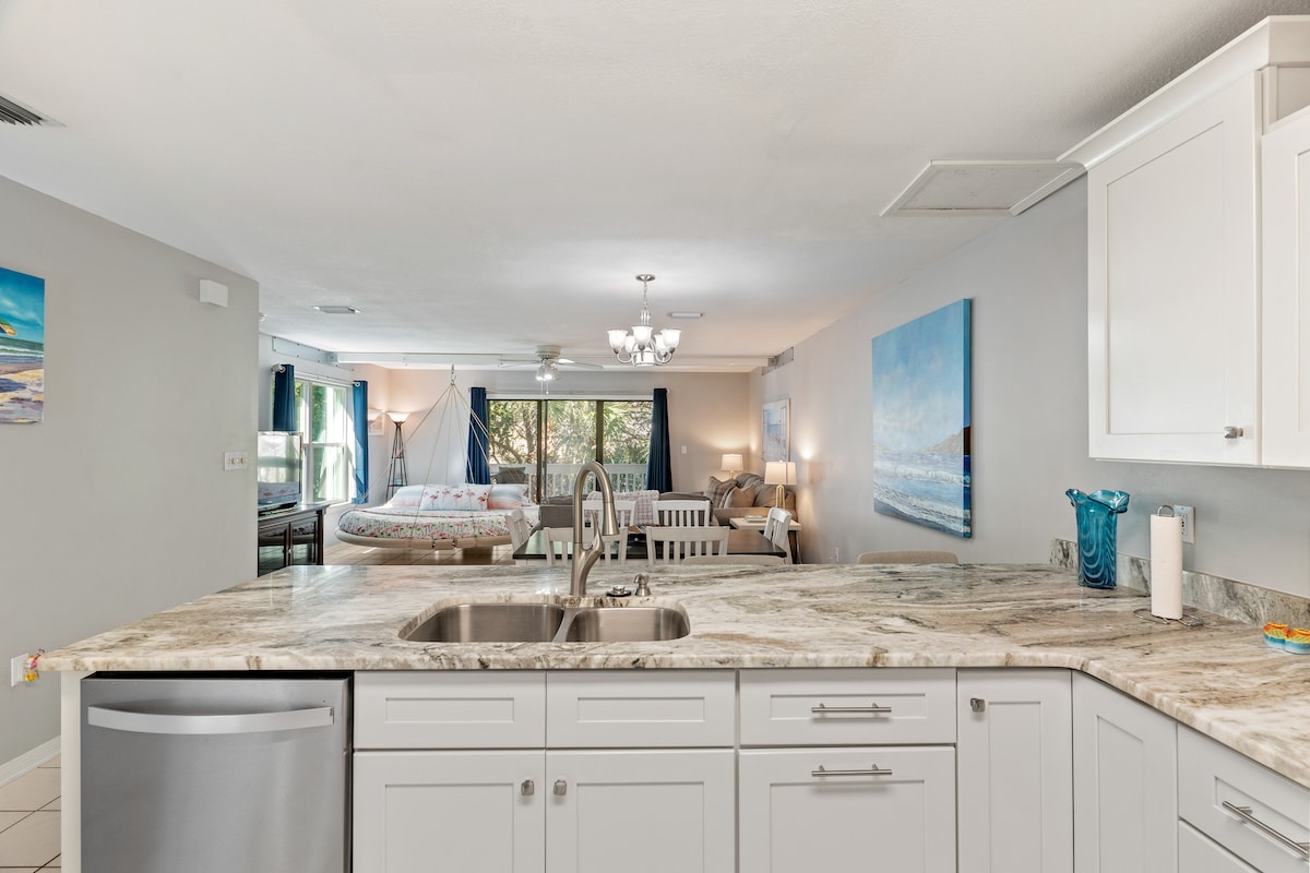 Newest studio on Navarre Beach. Steps away from the powdery white sand beaches and crystal clear waters. From your room, overlook the Santa Rosa Sound while enjoying the extraordinary sunsets. You are just a short walk to amazing shelling, swimming, paddle boarding, boogie boarding, kayaking , or just plain relaxing at "The Most Relaxing Place in Florida."