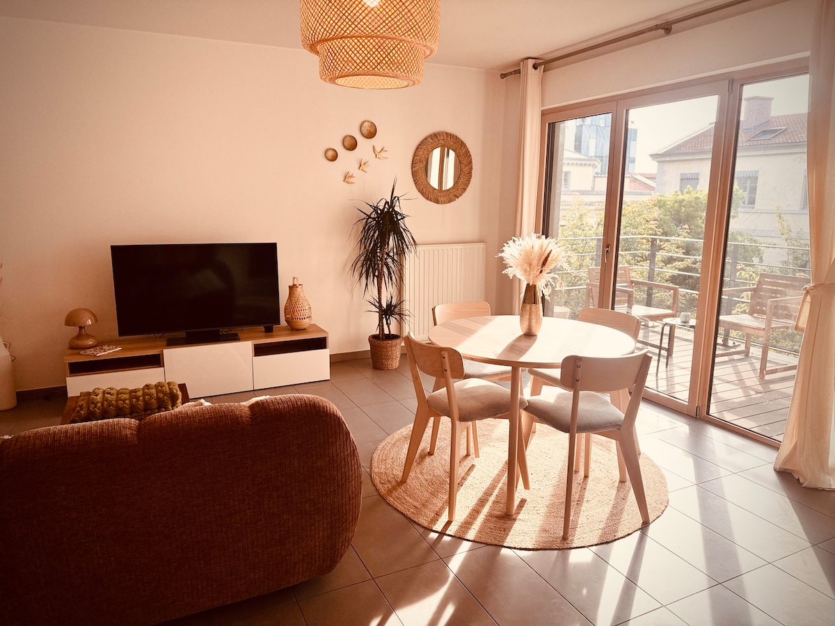 Beautiful 1-bedroom apartment in the heart of Confluence, perfect for a weekend getaway, a business trip, or teleworking. New apartment, very bright, quiet, and fully equipped, with a large, comfortable living room, a modern open-plan kitchen, and a lovely furnished terrace (outdoor sofa, parasol, electric BBQ). Separate bedroom with a real door for added privacy, 140-cm bed with Tempur mattress, large walk-in closet. Mobile air conditioning in summer. Tram nearby, Perrache train station within walking distance, shopping mall, restaurants, museum, cinema, and riverbanks.