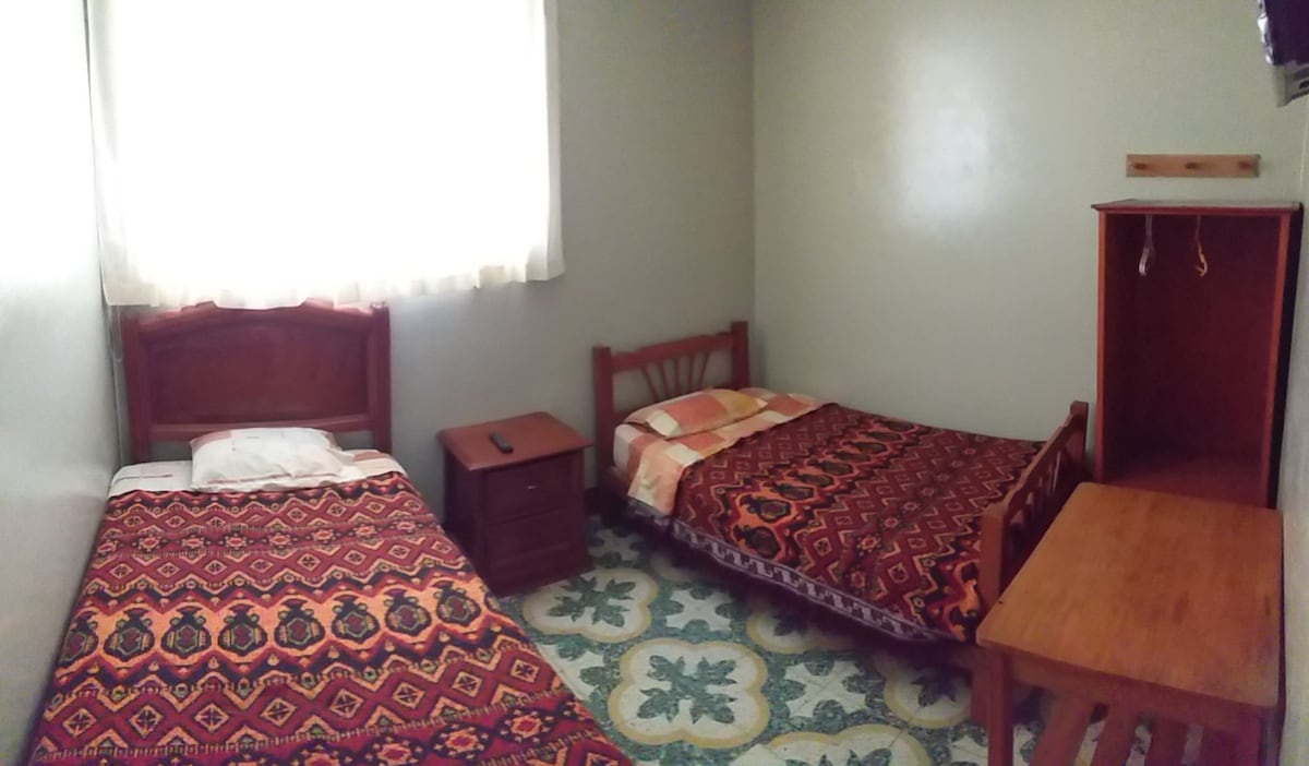 The room HAS A DOUBLE BED, and a single bed, and a bathroom inside the room. Personal cleaning supplies: 3 towels, a roll of paper, two soaps, two shampoo pads. (depending on the number of guests) It has a nightstand, a wall hanger, a table (70 cm X 70 cm) WITH TWO chairs, A doormat. IT HAS a vase with a copy of the flowers from the area, two paintings made by Cusco artists.