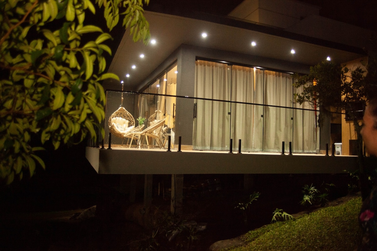 Modern and well-furnished house with stunning views of the Lagoon. Large suite, queen size bed, bed and bath linens, heated Jacuzzi, whirlpool, chromotherapy, bubble system, fireplace, air conditioning, Wi-Fi, 32" TV, equipped kitchen and balcony with barbecue. Located on a 1-hectare property on the edge of the Lagoon. It offers SUP, kayak, rental, sand courts, boat pier, jet-ski, fishing weir or a beautiful lagoon bath in front of the house. Perfect for unforgettable moments!