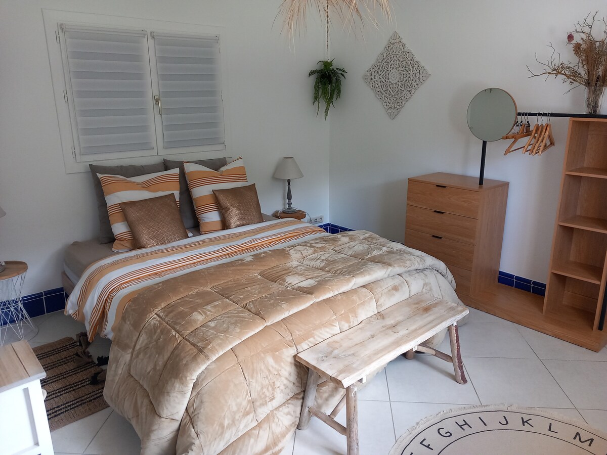 Discover this 100% natural gîte and its terrace, perfect for relaxing under the olive trees. In a palette of soft tones of straw and limestone, the bastide reveals a harmony of ecological materials and handcrafted objects in the colors of Provence. Guests can freely access the estate's swimming pool (shared with the estate's second cottage, La Chapelle) Living room, open equipped kitchen 4 bedrooms with shower rooms and toilet (+1 independent ground floor toilet) eco-friendly bedding, duvets and pillows, organic bed linens Private panoramic terrace Estate swimming pool access This is a part of the Bastide with independent access. The second part of the Bastide is occupied by the owners but faces the other side. An old chapel converted into a cottage is also part of the Domaine. Access to the Domain's swimming pool (Shared with the Domain's second gîte) A 6-hectare estate planted with more than 300 century-old olive trees that you can discover with good shoes. An ecological project based on 5 main axes: 1/Protection of existing heritage 2/Use of healthy and natural materials 3/Limitation of energy 4/Water management 5/Waste management 1.5 km from the center of Grasse, stay in a typical Provençal haven of peace, surrounded by olive trees and enjoy stunning views of the hills. Nice Cote d'Azur Airport 35 minutes away. Cannes train station is 20 minutes away. St François district accessible by car from the center of Grasse, by bus (Line 9 Jeanne Jugan) or even on foot (30 minutes with unevenness) The owners' house is still under construction but does not generate any nuisance.