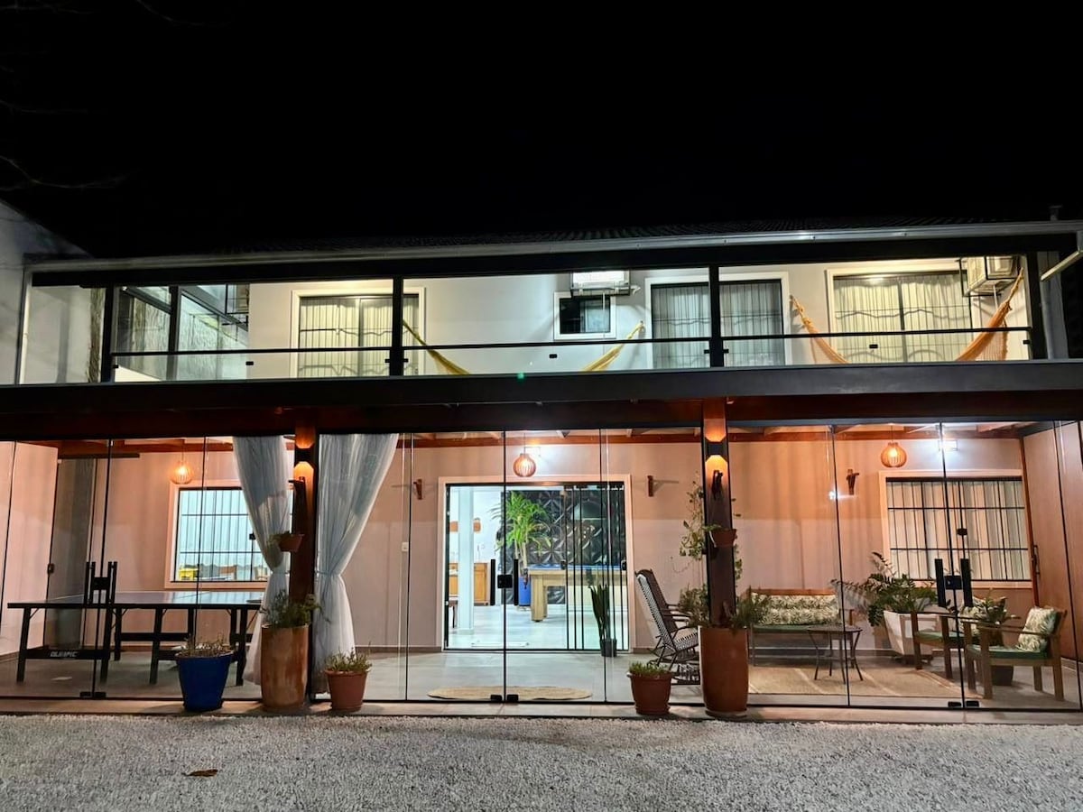 Our home is strategically located in the central region of Penha, approx. 5 minutes' walk from Praia Alegre. In just 10 minutes you can reach Balneário Piçarras Beach and Beto Carrero World in about 15 minutes by car. The house has more than 520 m², with 7 bedrooms, 4 of which are en-suites, all with air-conditioning, and a large outdoor area ideal for barbecues and family moments. Excellent location, close to supermarkets, pharmacies, restaurants and local shops. Pets are welcome!