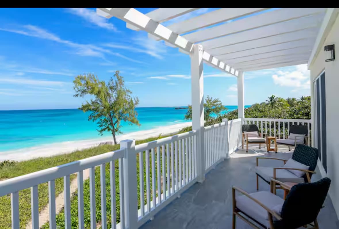Luxury villa with one of the best ocean views on Exuma! Overlooking Palm Bay beach and famous Jolly Hall beach. Private pool with ocean view. Large wrap-around balcony upstairs and patio on lower level. Watch sunrise over the beautiful ocean from your bed. Convenient location close to beach, restaurants, Georgetown and shops. 4 bedrooms- 3 bedrooms have ocean views with en-suite bathrooms, one bedroom downstairs. Spacious living with modern kitchen. Sleeps 8