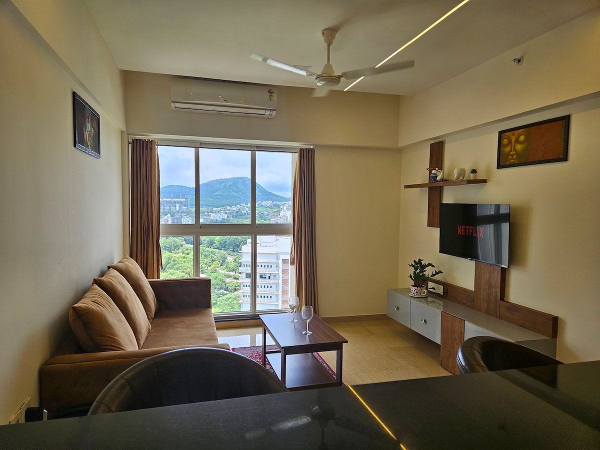 Take in the sunshine, breathe in the fresh air and enjoy the great outdoors. *Fast WiFi Enabled* Bedroom-Hall-Kitchen all Furnished with AC in all rooms and a Breathking View from the Living attached balcony, we Guarantee peaceful holiday at our heavenly adobe Our home on the banks of pawna river on the 20th floor will leave you with Serendipity, Solace, Surprise. Love and lot of care with which we have designed our stay specially for traveller's, weekend getaway and working professionals.