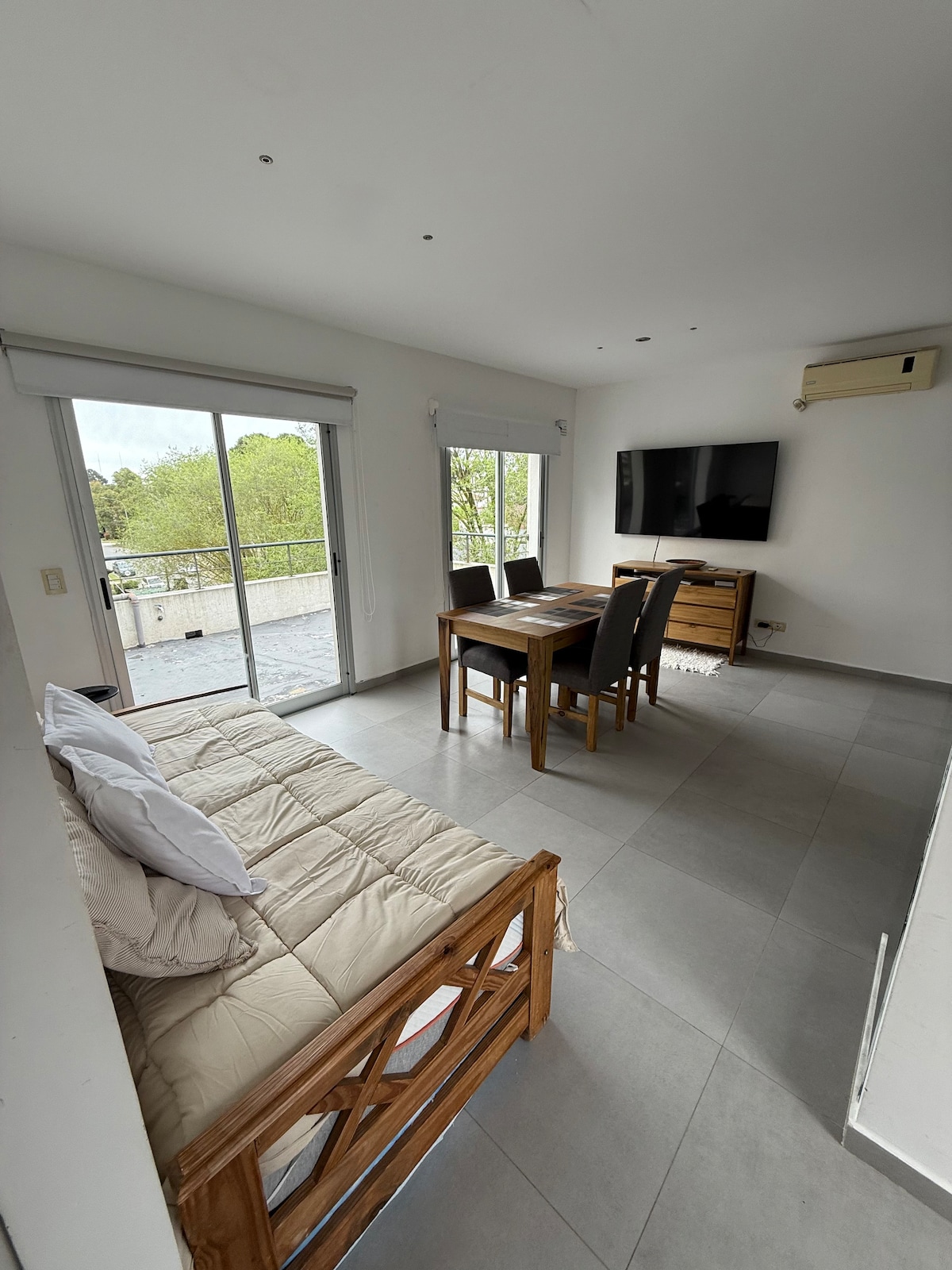 Studio located in downtown Pinamar, 7 blocks from the sea. Super-equipped, shared patio, ideal for getaways. The train station's bus drops you right at the door. The apartment has: Shower with good pressure, kitchen, natural gas, plugs near bed, living area, refrigerator, microwave, air conditioning/heating, kitchen utensils, cable channels, closet, dining table, clothes rack, toilet paper, free WiFi Bring sheets and towels Young people January and February Student discounts