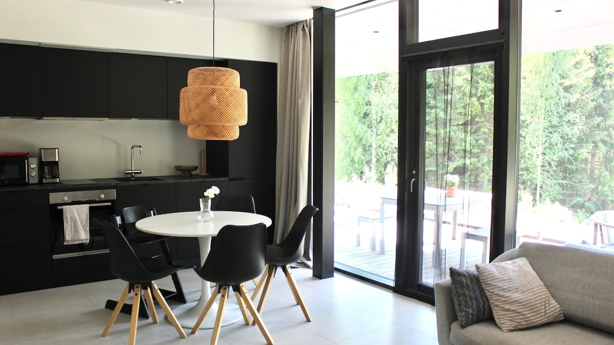 Experience easy living close to the city center. Park for free and charge your car at a low price. Experience a refreshing connection to nature, e.g. to mountain bike trails from your backyard. Start your morning with a nature walk, relax in the soft saunas and enjoy refreshments on the sun terrace. Prepare your food in a stylish kitchen, dine on your own covered terrace and enjoy a relaxing evening in the living room with Netflix or in the city with cultural and entertainment offerings. Ice bath option for an additional fee of 25 euros (5.8.2024->).