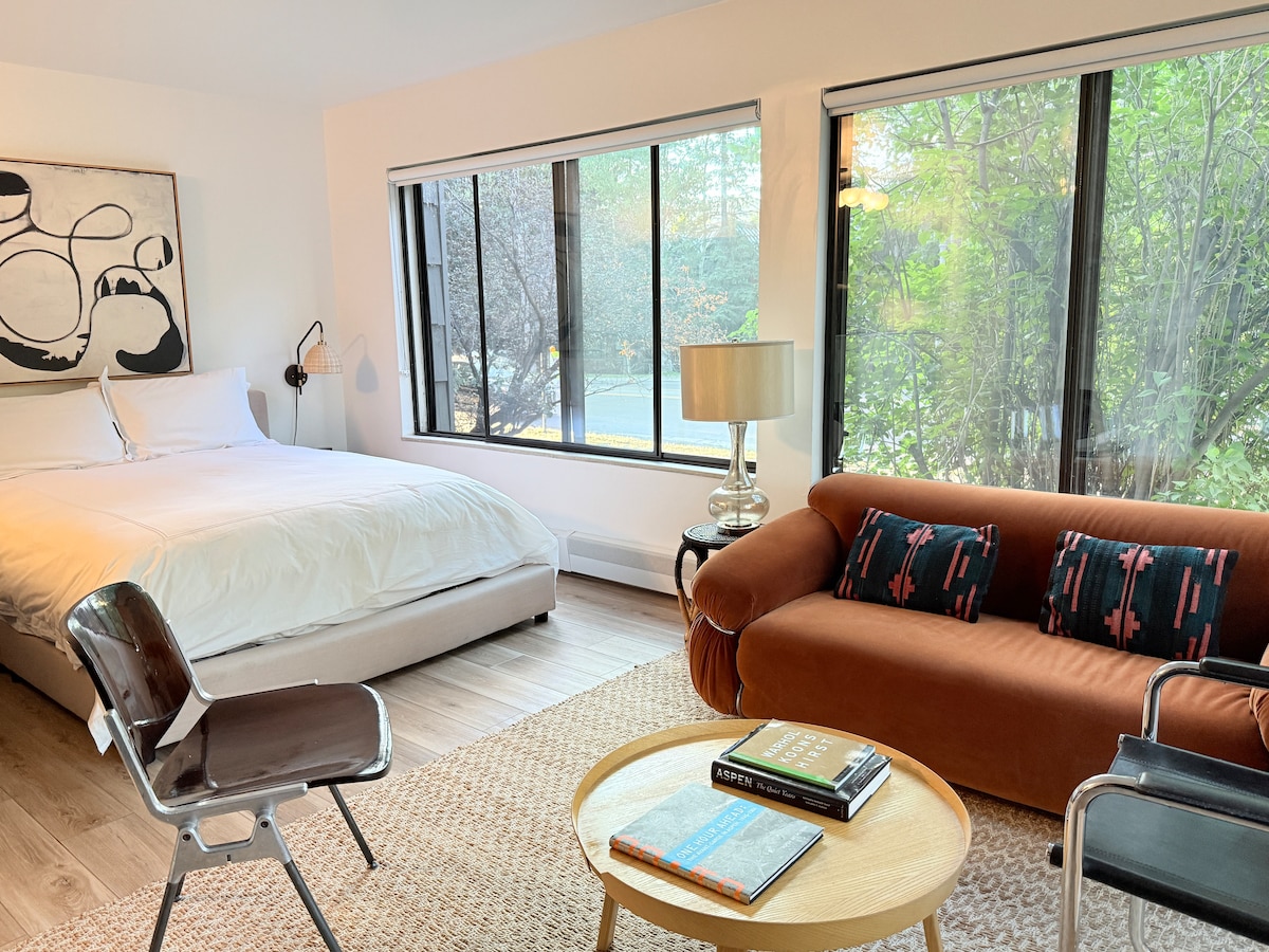 Stay in tasteful luxury just steps from Snowmass Village Express and Snowmass Mall. This beautiful studio condo is exquisitely furnished with an effortless blend of rustic and modern finishes, with tons of natural light from its six large windows. No need to drive to the ski hill! Put your gear on at the unit and walk just 100 feet to the slopes. In the summer, there's equally easy access to the best hiking and mountain biking in Snowmass. Welcome to your own alpine Paradise! #050722