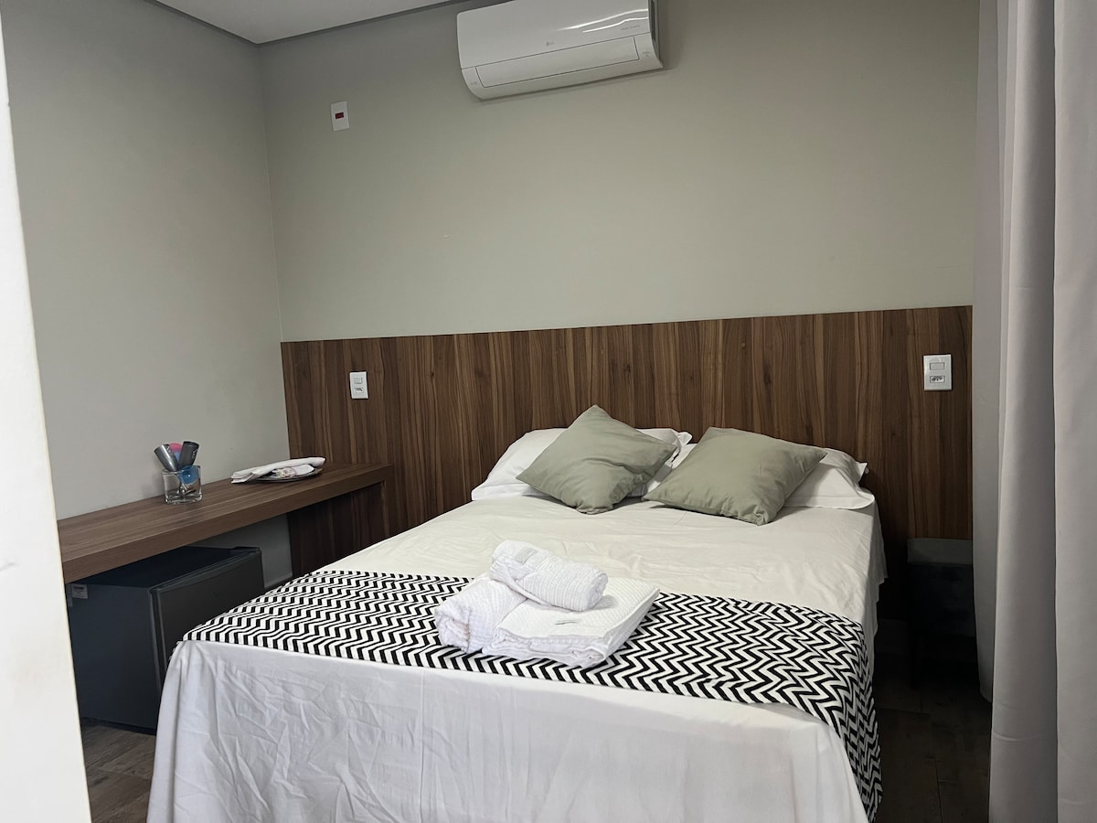 Ideal para casais, o quarto econômico possui cama de casal, TV, frigobar, cabideiro, roupas de cama e ventilador. O banheiro é compartilhado!!!