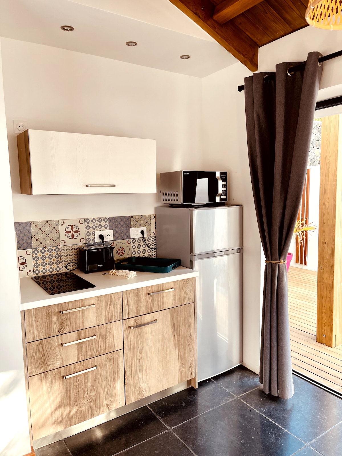 Cozy Tiny in a green setting, 5 min walk to L'Hermitage lagoon. Close to all amenities (bakery, supermarket, restaurants, as well as a bus stop). With its beautiful garden of lush palm trees and terrace, it is fully equipped to make your stay as enjoyable as possible! Air-conditioned, it has a bed (2 seats, 140/190) as well as a bench (1 seat bed), an indoor and outdoor shower, induction stove, microwave, fridge and Nespresso.