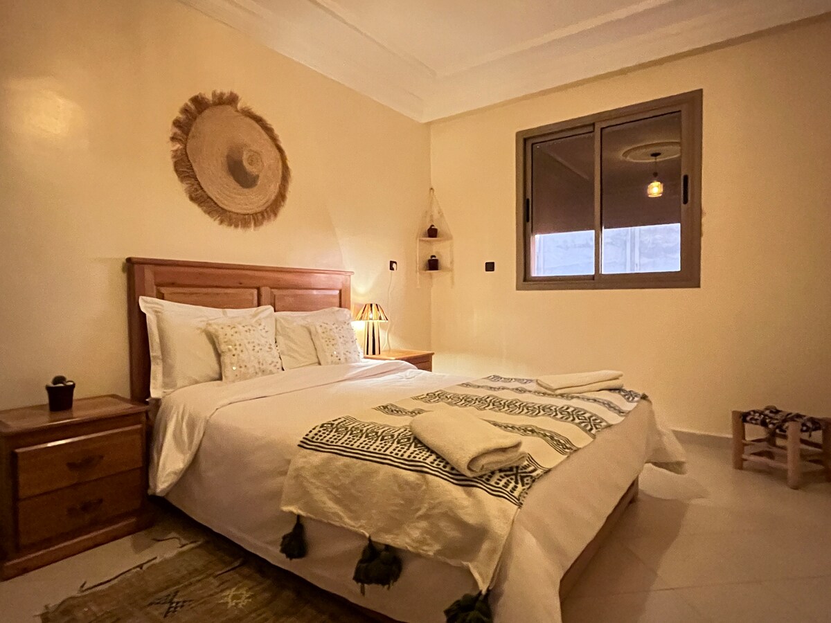 Enjoy a peaceful stay in this fully equipped apartment featuring a panoramic terrace, a shared swimming pool, and stunning mountain views. Perfect for couples, families, or remote work. Ideally located just a short drive from Banana Beach, only a few minutes from Taghazout, and Agadir.