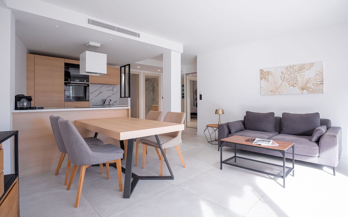 Open drapes to let light pour into an open-plan kitchen and living area. Unlatch French doors and step onto a narrow balcony with views of a charming streetscape. The neutral decor is brightened by splashes of color in the cushions and artwork. The apartment is Central Cannes, a 6-minute walk to La Croisette and its sandy beaches. Restaurants, bars, shops, a supermarket, and the Marché Gambetta open-air market are within easy walking distance. The train station is also close by.
