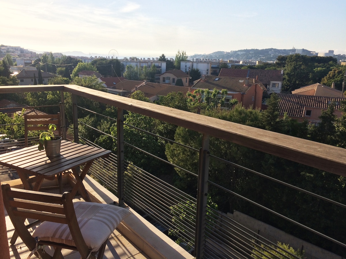 Studio climatisé. Vue 360° de la terrasse mais aussi du studio: vue mer et iles, vue colline Marseilleveyre, aperçus stade vélodrome et Notre Dame de la Garde. Salle de Bain vue mer Parking gratuit et sécurisé Bastide atypique dans un cadre bucolique Environnement très calme Terrasse de 25m2 avec chaises chiliennes, table bistrot et chaises Kitchenette équipée (plaque induction, micro onde, frigo) Studio avec canapé-lit très confortable WIFI