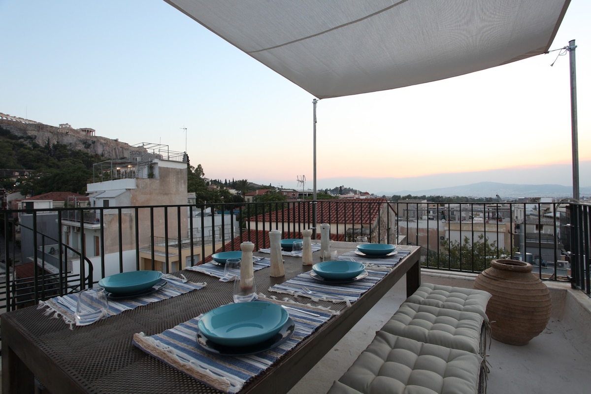 A rooftop studio is overlooking the city's glorious history, on the slope of Acropolis hill in the heart of the oldest and most lively section of Athens! A place of romance and serenity, well designed for only 2 with a unique spacious private terrace and outdoor fireplace, comfortable outdoor couch,tempt you to linger over the breathtaking city views! You will love the combination of having everything you need in walking distance while staying on a peaceful suite for the most memorable stay!