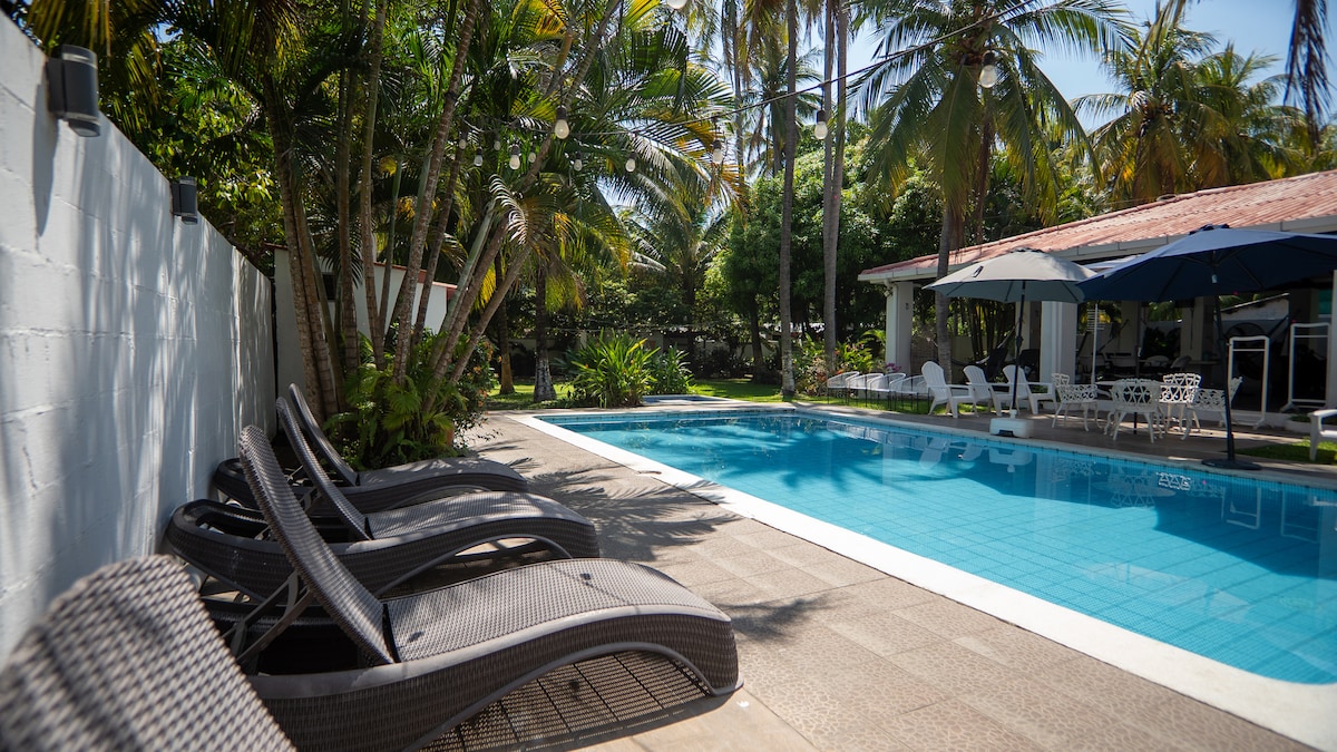 Relax at our peaceful beachfront house on the ocean in Playa San Diego. Our house is a well equipped 3-bedroom ranch with a large living/dining area and outdoor patio overlooking the playa. Outside is a beautiful garden with flowers and fruit trees, a large pool, a covered patio and a mirador to give you a birds-eye view of the beach. From here you can watch beautiful sunrises and sunsets, listen to the surf and see surfers, fisherman and wildlife all from the comfort of a covered mirador.