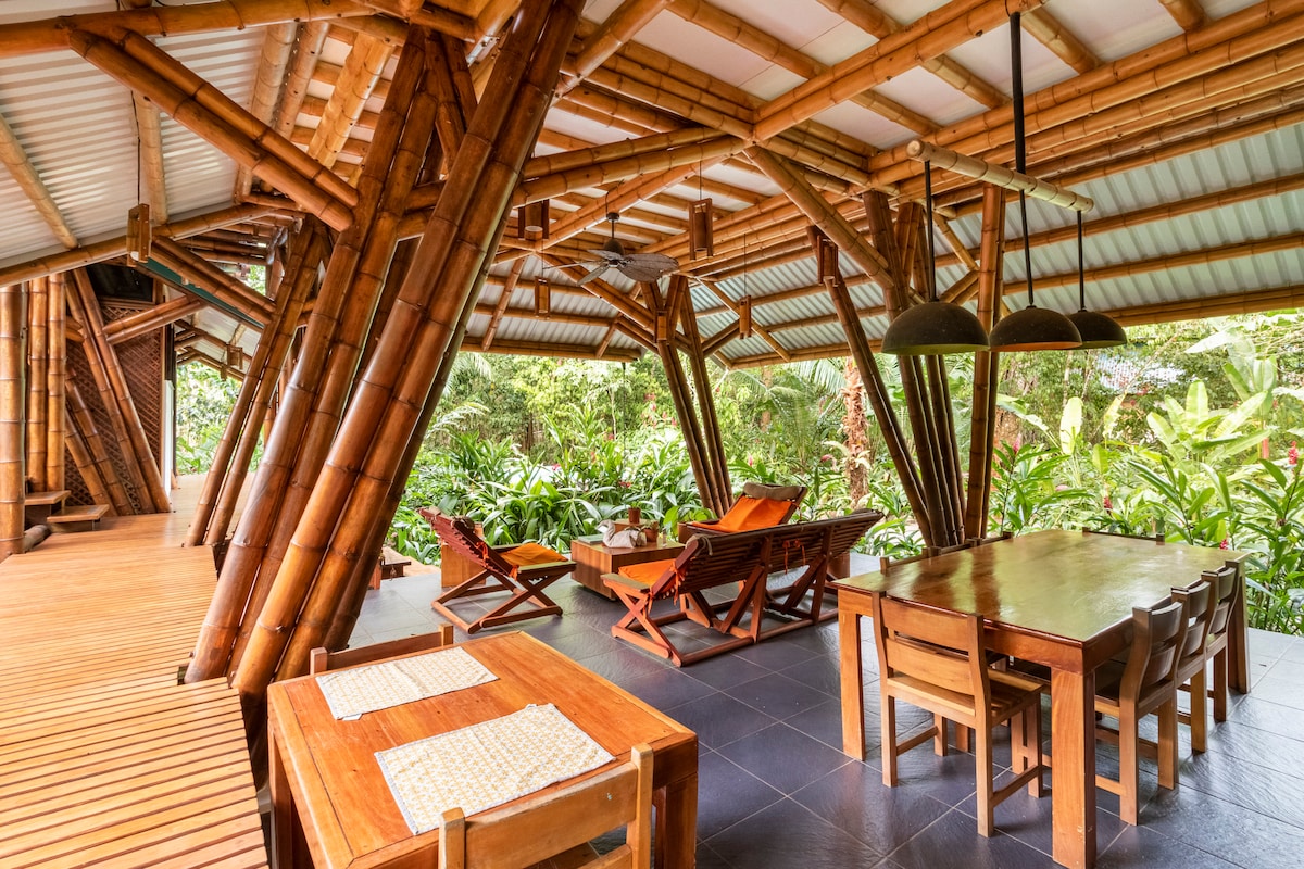 Casa del Bambu: A spacious retreat with a king bed in the bedroom, a twin bed in the living room (another second twin bed upon request), A/C, two smart TVs, high-speed Starlink WiFi, a large bath with a hot shower, and hot water at every faucet. Enjoy cooking in the fully equipped, screened-in semi-outdoor kitchen and unwind on the serene terrace amid lush landscaped gardens, just a 5-minute drive to Puerto Jiménez, close to beaches, restaurants, banks, and amenities.