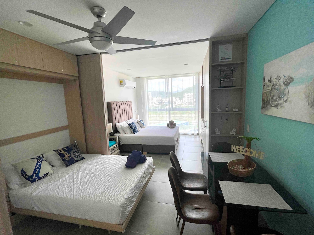 New luxury suite with a jacuzzi on the balcony. It is located in the best and most exclusive area of Santa Marta. It's next to the Hilton Hotel, Irotama Hotel, and Mercure Hotel. It has everything you need to spend an unforgettable vacation. You have a kitchen equipped with a refrigerator, induction stove, pots, coffee maker, kitchen utensils, microwave and air fryer. It is 8 minutes from the airport and very close to the Zazue Mall. Take advantage of discount prices and Book Now.
