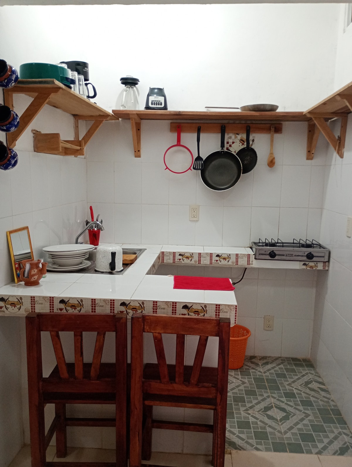 La Selva has a king size bed and a single bed, its equipped kitchenette, bathroom and private terrace. From October to March you can see the sun rise over the sea, in rainy season, if it comes with a lot of wind, the water can get into the room through the mosquito net windows. The arrival time is after 2, the check out at 12. Marisol is there from Monday to Saturday from 9 to 5, if you arrive later, you have to let us know.